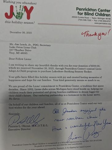 The club also supports Lake Orion High School seniors each year with scholarships; supports Lake Orion Little League and First Robotics teams; contributes to the Lake Orion Schools Special Needs Christmas Party; contributes to the Lions Bear Lake Camp, the Penrickton Center for Blind Children, the Corewell Beaumont Silent Children program and Leader Dogs for the Blind.