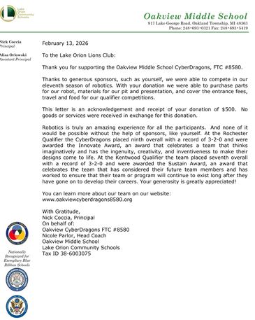 Letter of acknowledgment for Lake Orion Lions Club generous donation to the Oakview CyberDragon Team #8580 during the 25-26 season.
