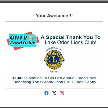 Lake Orion Lions Club donated $1000 to the ONTV Food Drive. The donation is to benefit Oxford/Orion Fish Food Pantry.